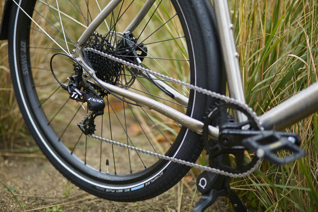 Alfine 8 is the ultimate in hasle free and affordable drivetrains – combined with a titanium frame and gates belt, this bike will outlast any other bike with minimal service needed.